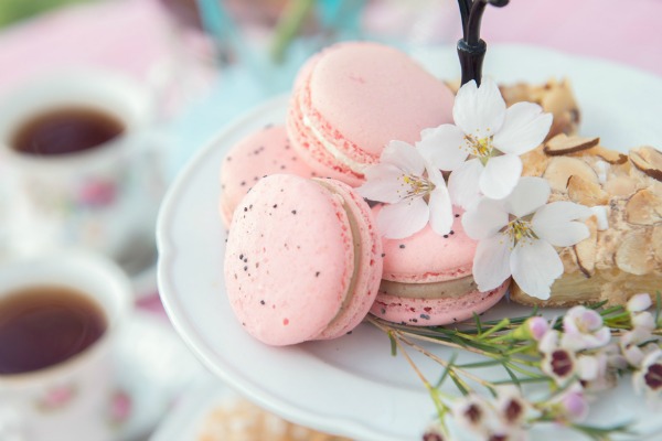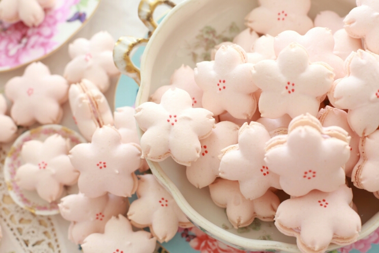 7. Antes de que los macarons endurezcan mientras aun esten blanditos, lava y escurre bien las flores de sakura y coloca una en cada macaron presionando con mucha delicadeza para que no se rompa.